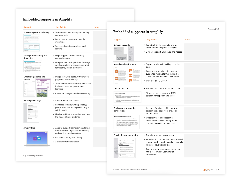 Check out the Supporting All Learners section in the Amplify Texas PD Library, and click on Embedded Support in Amplify. There you’ll find a great resource that shows all the supports you can access in your Tier 1 program for grades K–5.