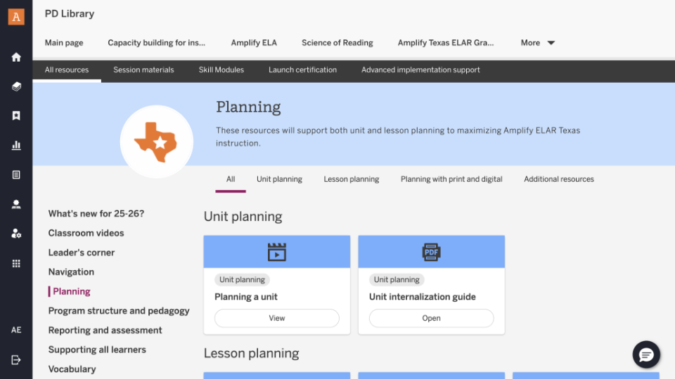 Middle school teachers have been asking for TEKS lesson alignment; our Texas team heard you and has delivered! Partners now have an incredible new resource for the 2025–26 school year that provides lesson alignment to TEKS across every unit, lesson, and grade. When you are in the TX PD Library for 6–8 ELAR, navigate to Lesson Planning and open Amplify ELAR 6–8 Lesson Alignment to TEKS.